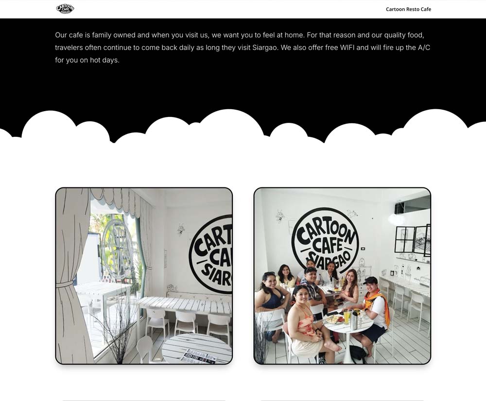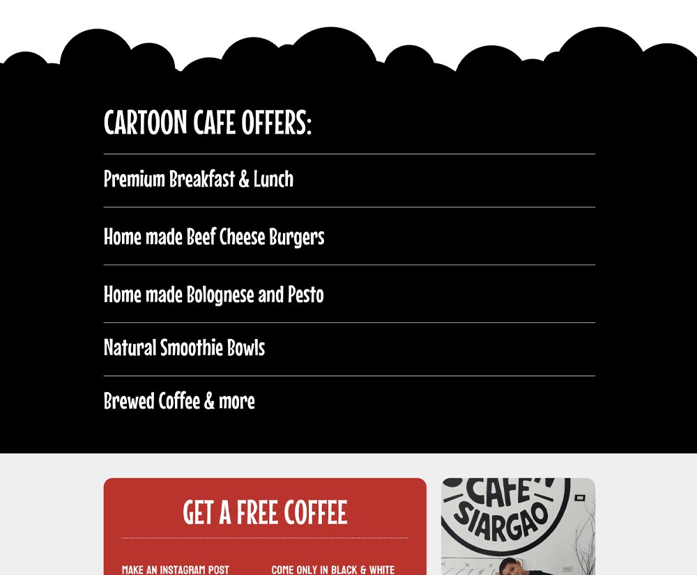 A simple one page website for an artsy Resto Cafe that reflects their “Only Black & White” concept with only red as contrasting color chosen for their website. This website shows that even a basic and simple website without menu can be clean and professional.